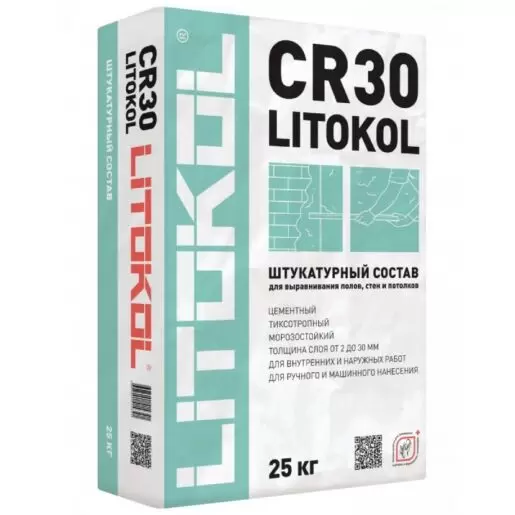 Смесь Litokol CR30 - это цементный штукатурный тиксотропный состав для выравнивания полов, стен и потолков. Толщина нанесения от 2 до 30 мм, используется для внутренних и наружных работ.